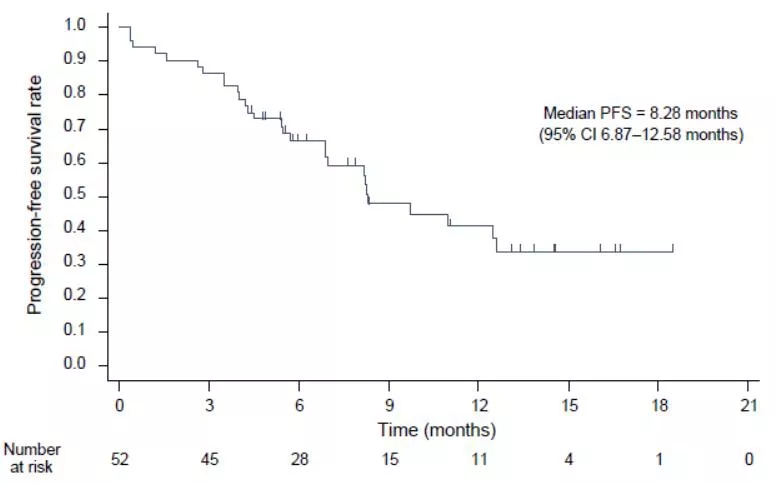 52例患者的中位PFS为8.3个月(95% CI: 6.9-12.6个月)(图8),46.2%的患者仍然接受奥希替尼的治疗。患者6个月、12个月及18个月的PFS率分别为66.5% (95% CI: 51.7%-77.7%)、41.2% (95% CI: 25.8%-56.1%)和33.7% (95% CI: 18.8%-49.4%)。数据分析时,16例患者出现死亡,中位OS尚未成熟。
