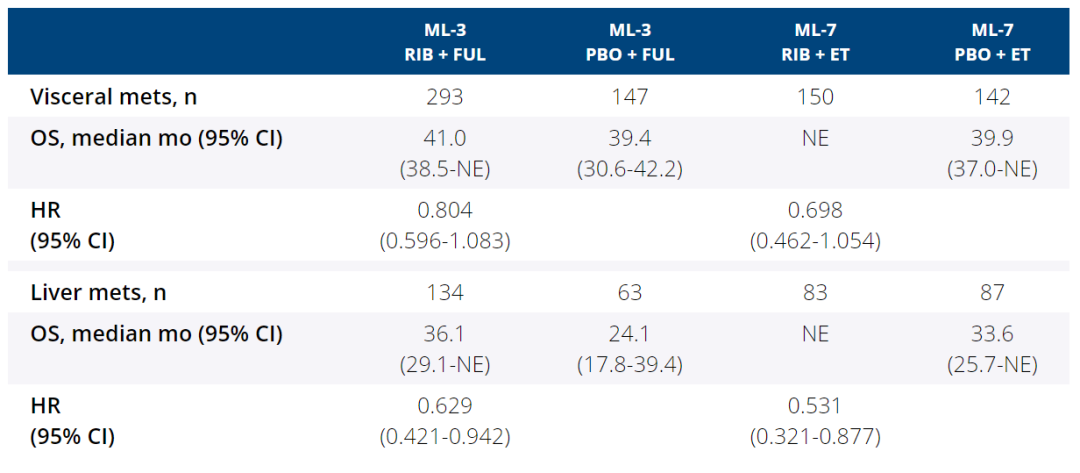 2.Overall survival (OS) in patients (pts) with advanced breast cancer (ABC) with visceral metastases (mets), including those with liver mets, treated with ribociclib (RIB) plus endocrine therapy (ET) in the MONALEESA (ML) -3 and -7 trials.J Clin Oncol 38: 2020 (suppl; abstr 1054)