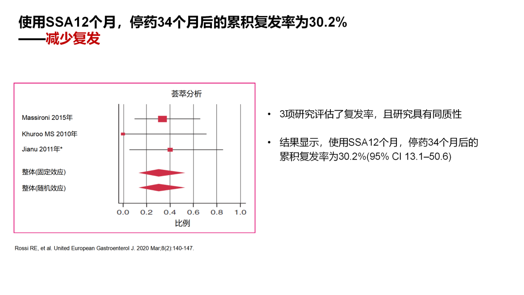 总体而言,SSA对于病灶多发或经常复发而不能通过内镜有效管理或切除的1型g-NENs患者,具有很好的缓解率和安全性。使用SSA 停药34个月后累积复发率为 30.2%。