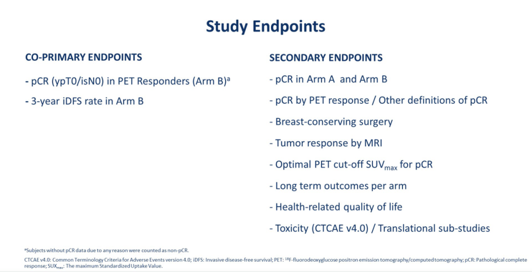 Prof.Cortes:其实我也无法确定用PET检查(与pCR适应性策略)是否可行,这项研究的另一个关键次要终点是每组患者的长期随访结果。如果这种策略可行(即患者达到“PET反应”或者由“PET反应”定义的pCR,可以考虑去化疗),我们才会进一步讨论是否用更经济的评估方法,比如超声或者MRI。
