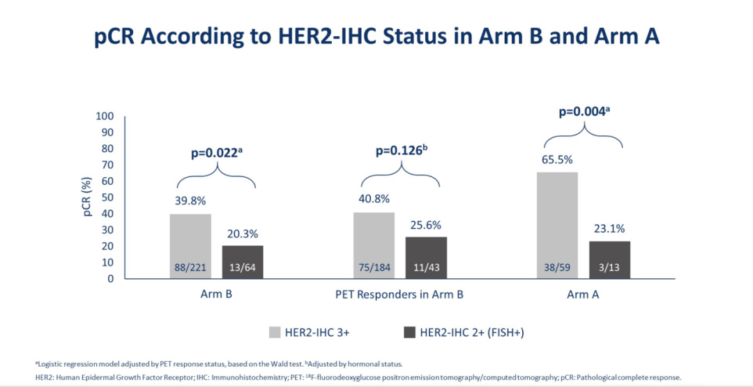 Prof.Cortes:我们不应该忽略哪些患者对PET检查的反应更好。ER-/HER2+患者对抗HER2治疗更敏感,因此,那些非HR阳性的患者反应更好,而这部分患者恰恰是可以进一步考虑去化疗的。在去化疗的B组(PH方案)患者中,ER阳性与治疗反应没有明显的相关性。但答案是非常清楚的,与ER阴性患者相比,ER阳性患者接受化疗的比例更高。我们需要更好地了解哪些患者不需要化疗,或许那些ER-,或者HER2IHC3+的患者更有可能对抗HER2治疗有反应,也更有可能用PET检查来评估疗效反应。