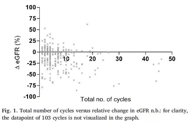 这项研究回顾性纳入359例患者,所有患者均至少接受1周期培美曲塞治疗。肾小球滤过率降低超过25%定义为出现终点事件。研究发现,21%的患者出现有临床意义的肾功能下降,8.1%的患者因肾功能下降导致治疗终止。接受培美曲塞治疗超过10周期的患者,其终点事件发生率可升高5.66倍。