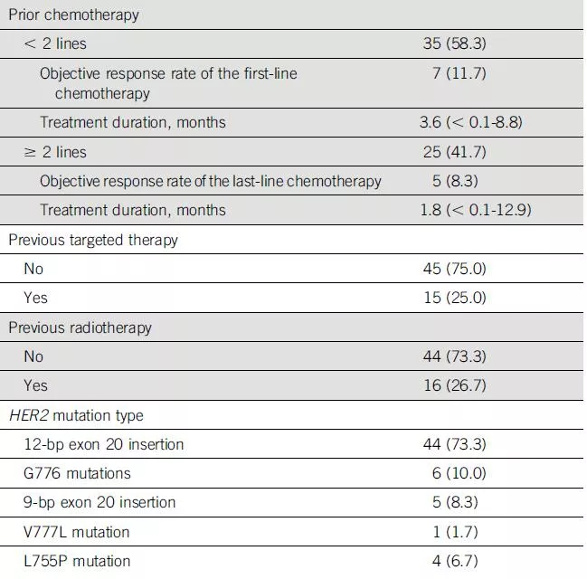 从2016年10月至2018年12月,共计86例携带HER2突变的患者接受筛查,60例患者入组。患者中位年龄57岁,96.7%的患者携带远处转移,41.7%的患者既往接受过至少2种治疗方案,没有患者接受过免疫治疗。患者突变类型如下:20外显子12个碱基对插入突变(71.3%),G776突变(12%),20外显子9个碱基对插入突变(8.3%),V777L突变(1.7%),L755P突变(6.7%)。中位随访时间为11.7个月,81.7%的患者停止治疗(图1)。