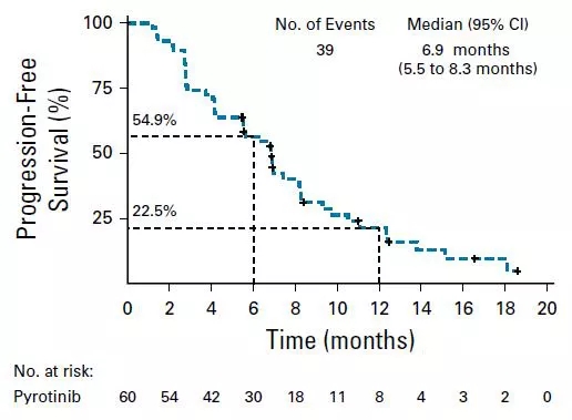 当前,NCCN指南仅把TDM-1作为HER2突变的晚期NSCLC治疗的2A类推荐。在晚期肺癌中,HER2突变约占1%~4%,但这部分患者并没有相应的靶向治疗。吡咯替尼是一款针对HER1/2及HER4的小分子酪氨酸激酶抑制剂。基于前期研究,吡咯替尼联合卡培他滨已经被批准用于HER2阳性的转移性乳腺癌患者,本研究旨在探索吡咯替尼在HER2突变的晚期肺癌患者中的疗效及安全性。