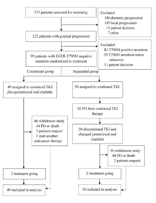 从2015年1月至2017年7月,共计573例患者接受筛查,222例患者出现疾病缓慢进展,最终99名患者入组并接受随机化。同步化疗组和续贯化疗组分别入组49例和50例患者,两组之间基线特点均衡可比。