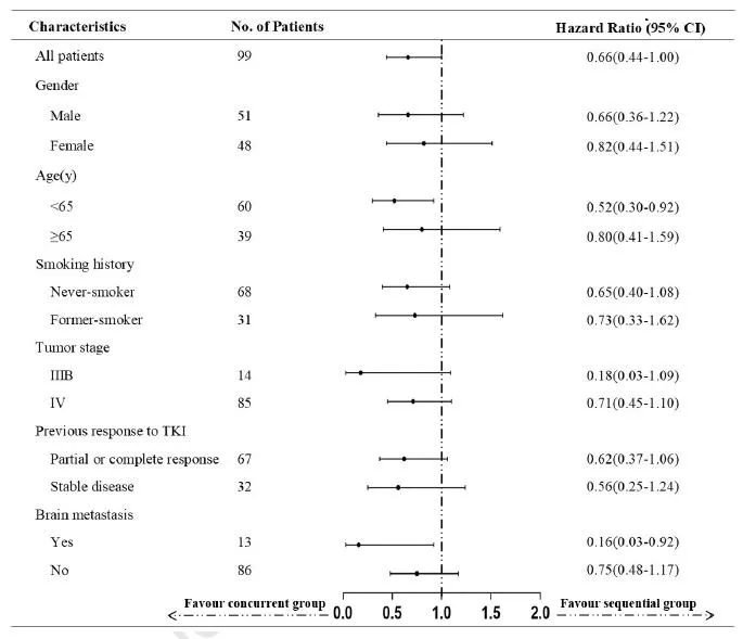 对于续贯治疗组,PFS1为1.8个月,50例患者均接受后续化疗,中位PFS2为3.8个月。亚组分析均支持同步化疗效果更好,其中,同步化疗在年龄≤65岁和脑转移患者中的HR分别为0.52 (95% CI: 0.30–0.92)和0.16 (95% CI: 0.03–0.92),差异有统计学意义(图3)。