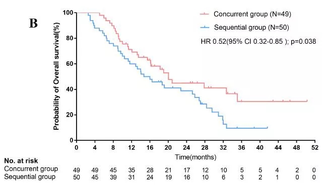 数据分析时,68.7%的患者出现死亡事件,两组分别有39例和37例患者接受后续治疗,同步治疗和续贯治疗组的OS分别为20个月和14.7个月(HR=0.52, 95% CI: 0.32–0.85;),差异有统计学意义(P= 0.038)(图4)。