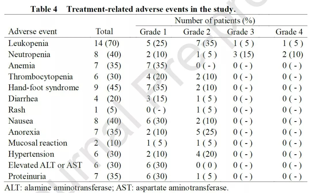 在安全性方面,患者1~2度不良反应发生率如下:淋巴细胞下降28%,手足综合症18%,中性细胞下降16%,恶心16%,贫血14%,厌食14%,高血压12%,血小板降低12%,转氨酶升高12%,腹泻8%,蛋白尿12%,粘膜反应4%,皮疹2%;3~4度不良反应发生率包括淋巴细胞下降2%,中性粒细胞下降6%。没有粒细胞缺乏性发热或阿帕替尼相关的3度及以上不良反应出现,没有治疗相关的死亡。只有一例77岁女性患者,经过4周期治疗后,因2度高血压合并手足综合症不可耐受而导致撤销知情同意(图5)。