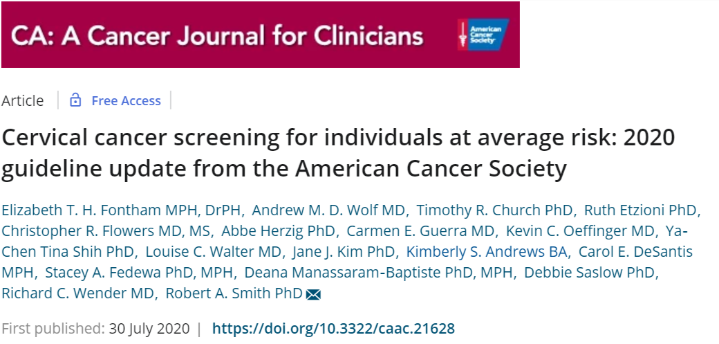 今年7月30日,美国癌症协会(ACS)在A Cancer Journal for Clinicians杂志上发表了《2020年宫颈癌筛查指南更新》。