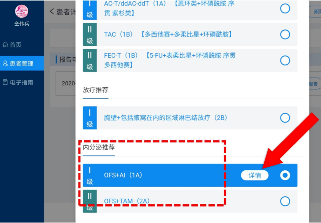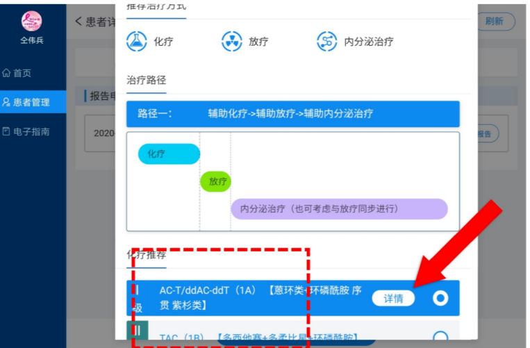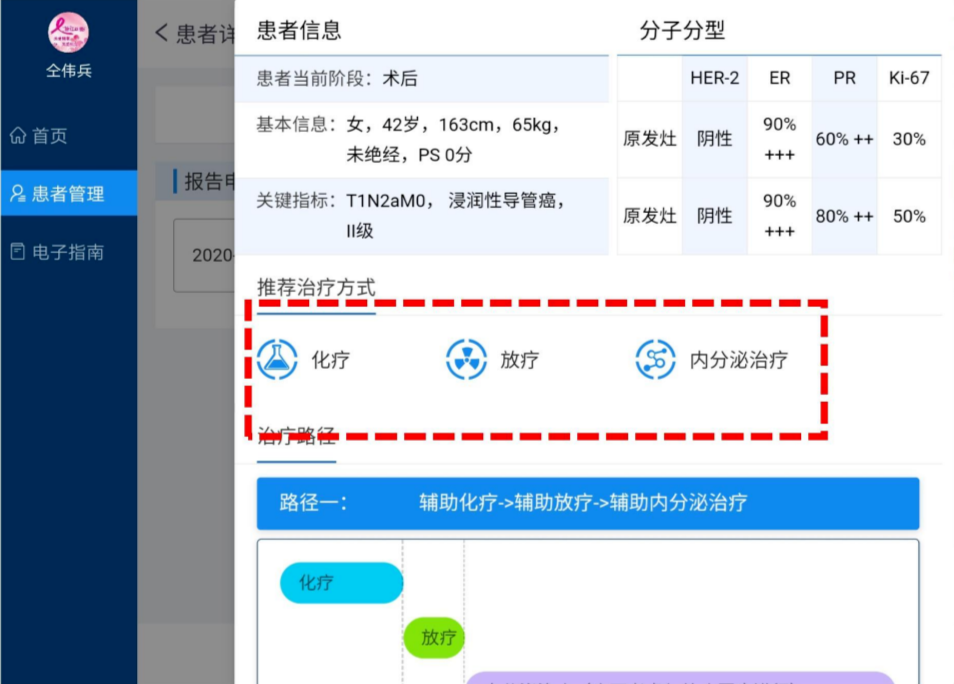 “CSCO AI FOR BC”智能决策系统的界面非常扁平化、简洁明了。当输入该患者信息后,系统立即给出了一系列规范化诊疗建议:推荐治疗方式,治疗路径顺序、治疗方案、推荐等级等。一目了然,十分清晰。患者可以很好的了解本阶段所需要接受的相关治疗,同时也可以通过治疗路径,清晰了解自身所处的治疗阶段及后续需要接受的相关治疗,从而增加患者的治疗依从性。