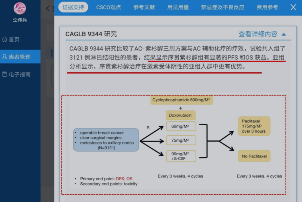 AI系统给出的治疗方案分别依据哪些询证医学证据呢?CSCO指南中的观点是什么?这些追问,系统也已显示出了答案。CSCO AI会根据患者的疾病特征,推荐不同级别的治疗方案,这种治疗方案也与CSCO BC指南相吻合。与此同时,当笔者想要了解方案背后的数据,只需要点击详情按钮,从而获得证据支持、CSCO观点、参考文献、用法用量、禁忌症、不良反应、费用参考等信息,关于这位患者规范治疗的所有询证依据也了如指掌了。