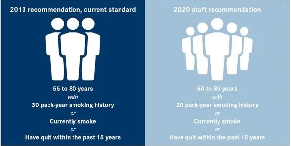 根据美国预防服务工作组(USPSTF)草案提出的建议,肺癌高风险人群风险将在50岁开始肺癌低剂量CT(LDCT)筛查,而先前的标准是55岁。2013年,USPSTF推荐对年龄处于55岁至 80岁有30包年吸烟史且目前仍在吸烟或戒烟时间不满 15 年的高危人群每年行LDCT肺癌筛查。