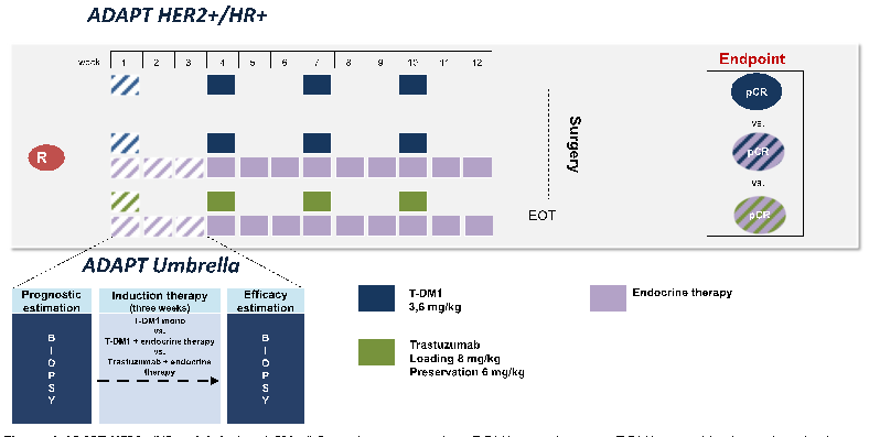 ADAPT,adjuvant dynamic marker-adjusted personalized therapy trial optimizing risk assessment and therapy response prediction in early breast cancer(辅助动态标记物调整个体化疗法优化早期乳腺癌风险评定和治疗缓解预测)的缩写,包括的注册研究有:ADAPT Umbrella:NCT01781338;ADAPT HR+/HER2-:NCT01779206;ADAPT HER2+/HR+:NCT01745965;ADAPT HER2+/HR-:NCT01817452;ADAPT TN:NCT01815242(图1)。