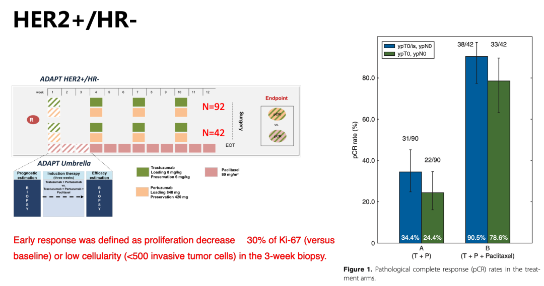 此项研究中,将HR-,HER2+者分成两组,一组接受12周的妥妥双靶治疗(H+P),另外一组是在妥妥双靶的基础上联合化疗(紫杉醇单药)进行三周的诱导后行穿刺活检,再将剩余的治疗完成(图5),目的是为甄别出单纯双靶而不化疗即可获益的亚组人群。研究结果显示双靶治疗联合紫杉醇组pCR率达到了90.5%,远高于双靶治疗组。而更为引起关注的是研究组对早期缓解的定义。为第三周进行穿刺活检时Ki67指数较基线降低超过30%或低细胞密度(low celluarity,计数浸润性肿瘤细胞<500个)。我们知道除了pCR,能否将可以达到pCR的患者提早预测出来同样重要,此项研究的另一个重要结果显示:早期缓解者更容易达到pCR。双靶治疗联合紫杉醇组中,42名早期缓解者中40名达到了pCR,最终的pCR率为95%。【6】