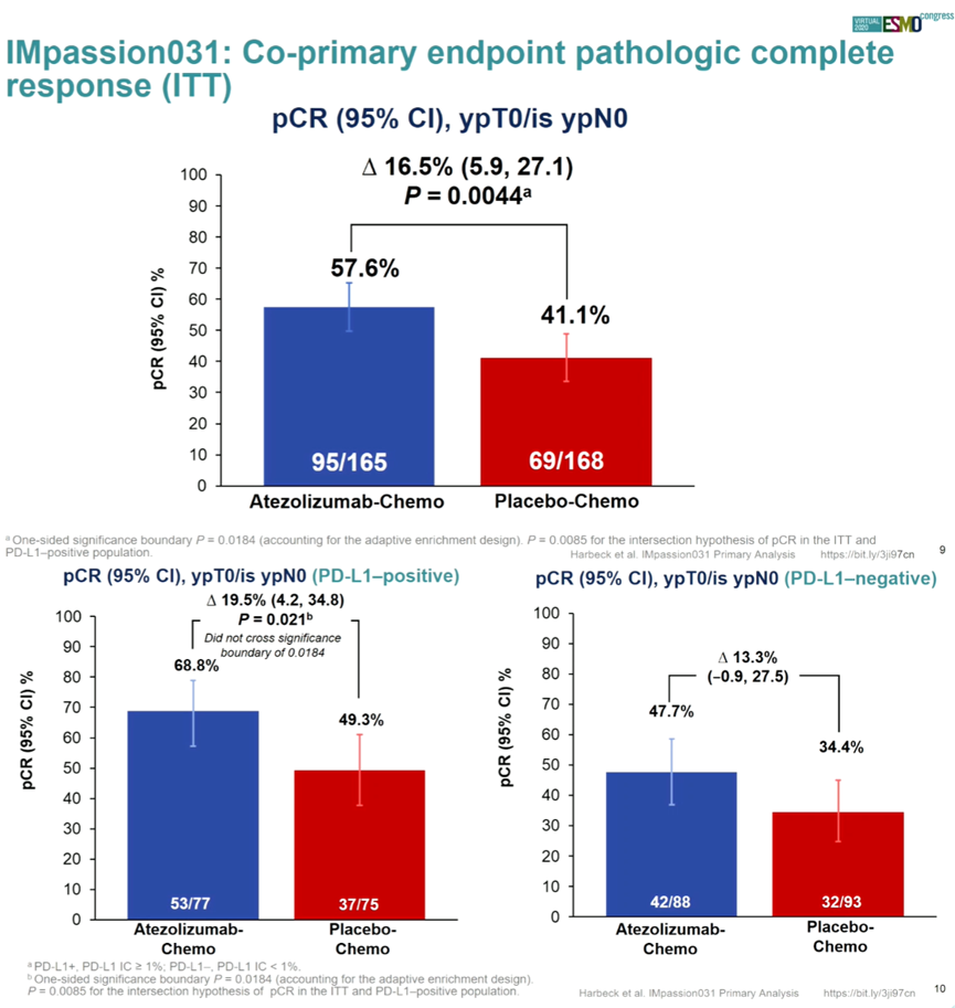 峰回路转,2020年ESMO会议IMpassion031研究结果重磅出世,力证Atezolizumab在TNBC新辅助治疗中的优势。该研究是一项多中心、随机、双盲的Ⅲ期临床研究,旨在评估Atezolizumab联合化疗在TNBC新辅助治疗中的疗效和安全性。入组年龄≥18岁、肿瘤>2cm、经病理证实为侵袭性Ⅱ-Ⅲ期且未经治疗的TNBC患者共333例,将其按照1:1进行随机分组。实验组接受12周Atezolizumab(840mg,IV,q2w)联合Nab-P(125mg/m2,IV,qw),序贯8周Atezolizumab(840mg,IV,q2w)联合多柔比星(60mg/m2,IV,q2w)+环磷酰胺(600mg/m2,IV,q2w);对照组接受12周安慰剂联合Nab-P(125mg/m2,IV,qw),序贯8周安慰剂联合多柔比星(60mg/m2,IV,q2w)+环磷酰胺(600mg/m2,IV,q2w)。随后所有患者进行手术,并对病理完全缓解进行评估,按照乳腺癌临床分期和肿瘤浸润免疫细胞PD-L1表达(IC≥1%VS<1%)进行分层分析。主要研究终点为ITT或PD-L1阳性(IC≥1%)患者pCR率,次要研究终点包括总生存期、无事件生存期、无病生存期和生活质量指标。预设单侧P<0.0184有统计学意义。