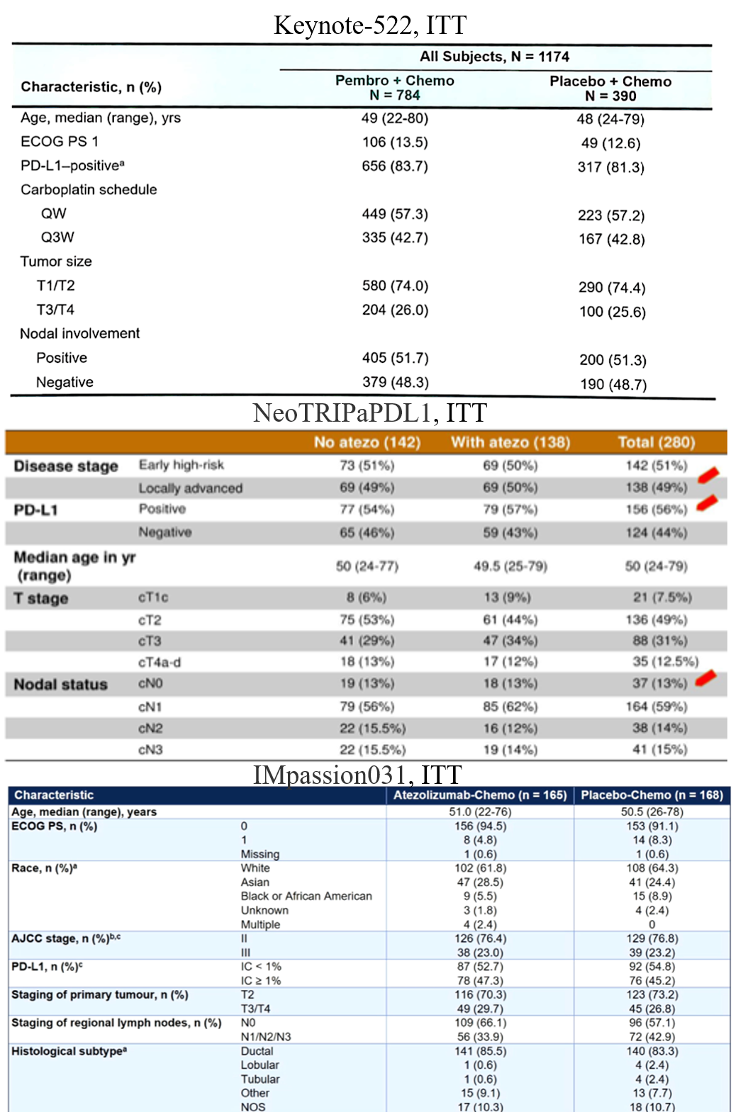 一、入组人群临床病理特征。NeoTRIPaPDL1研究入组的N0患者比例较低,仅为13%,T3/4比例较高,达46%;而IMpassion 031研究中N0患者比例为61.6%,T3/4比例29.7%;Keynote-522中N0患者比例48.3%,T3/4比例26%。从临床特征看,似乎肿瘤负荷低的患者更能从免疫治疗中获益,这可能与肿瘤早期对免疫微环境影响弱、局部晚期患者机体免疫状态相对低下有关。未来仍需要探索疗效预测的分子标志物以筛选免疫治疗的获益人群。