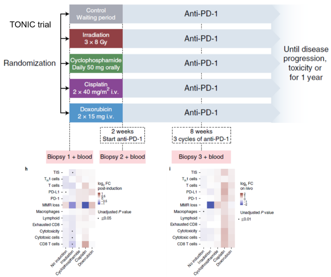 四、配伍方案。取得阳性结果的Keynote-522和IMpassion 031与阴性结果的NeoTRIPaPDL1相比,最显著的差异是有无联合含蒽环方案。蒽环类药物作为经典的强细胞毒性抗生素,不仅对肿瘤有直接的杀伤作用,还能诱导肿瘤细胞免疫原性死亡,激活树突状细胞的抗原呈递,增强CD8+T细胞增殖,同时选择性靶向作用于MDSC,解除肿瘤诱导的免疫抑制。在转移性乳腺癌的TONIC研究中,经多柔比星2周诱导后使用PD-1抑制剂Nivolumab可获得优于未诱导(17%)、放疗诱导(8%)、环磷酰胺诱导(8%)和顺铂诱导(23%)的最高ORR(35%),同时介导T细胞浸润,增强PD-L1表达和dMMR。dMMR常由DNA复制过程中的错配累积导致,或与蒽环类药物干扰DNA碱基配对与转录的细胞毒性机制有关。蒽环类药物在免疫治疗配伍中的价值值得进一步探究。