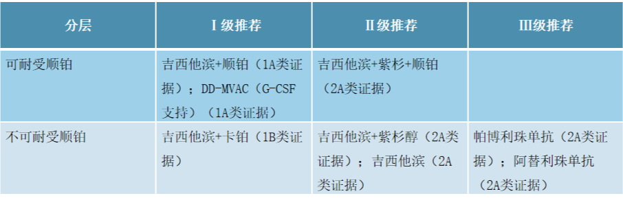 对于可耐受顺铂化疗的患者,“指南”推荐顺铂联合吉西他滨化疗(Ⅰa);对于肾功能处于边界范围或轻度异常情况下(eGFR为40-60ml/min),顺铂可以考虑分次给药进行(如35mg/m2 d1,2或d1,8)。对于不耐受顺铂化疗的患者,推荐行吉西他滨联合卡铂化疗(Ⅰb)