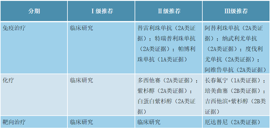 对于既往铂类化疗和免疫治疗失败的转移性膀胱癌患者,指南推荐行厄达替尼治疗(Ⅱa)。对于既往未接受过免疫治疗的患者,指南推荐行特瑞普利单抗(Ⅱa)、帕博利珠单抗(Ⅰa)以及替雷利珠单抗治疗(Ⅱa)。
