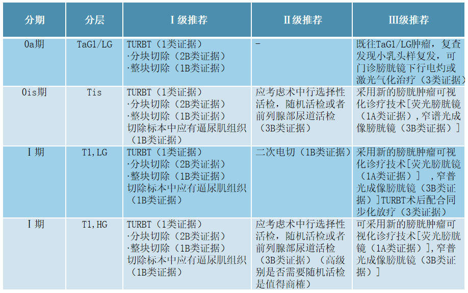 对于疑似或确定TURBT未完全切除肿瘤、首次切除标本中未见肌层组织(除TaG1/LG或初发原位癌)、T1期膀胱肿瘤的患者可考虑在术后2-6周行二次电切。存在肿瘤为原位癌/多发癌、位于膀胱三角区或者胱颈、尿脱落细胞学阳性或者前列腺部尿道粘膜异常等情况的患者建议行前列腺部尿道活检。