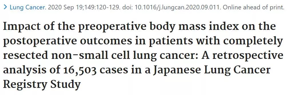 对于完全手术切除的非小细胞肺癌(NSCLC)患者,术前体重指数(BMI)对患者长期预后的影响目前尚不明确。近期,来自日本的学者借助日本肺癌联合登记委员会的大数据分析发现,患者术前BMI对预后有显著影响。研究结果于9月19日发表于最新一期的Lung Cancer杂志。