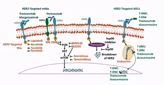目前正在进行的研究为曲妥珠单抗耐药人群提供更精准有效的治疗方案。曲妥珠单抗原发性耐药患者,可以使用吡咯替尼或者在曲妥珠单抗的基础上联合吡咯替尼;曲妥珠单抗继发性耐药可保留HP双靶或者曲妥珠单抗+吡咯替尼。从机制上讲,与曲妥珠单抗作用于胞外抑制HER2信号转导不同,小分子TKI吡咯替尼作用于胞内,阻止HER家族(包括HER1/ HER2/HER4)同/异源二聚体形成,抑制自身磷酸化阻断下游信号通路的激活,所以即使曲妥珠单抗耐药,吡咯替尼依然有效。目前由胡夕春教授牵头的一项关于吡咯替尼联合卡培他滨治疗曲妥珠单抗耐药的HER2阳性晚期乳腺癌的单臂、多中心II期临床研究正在入组中21。