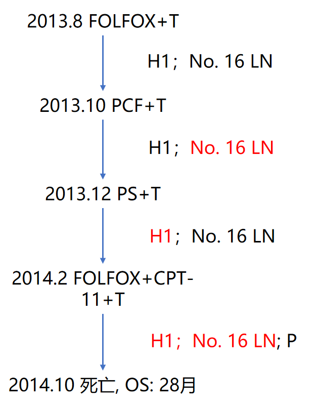 • 再次入院:改用FOLFOX+T(起始 8mg/kg)(2012-08)