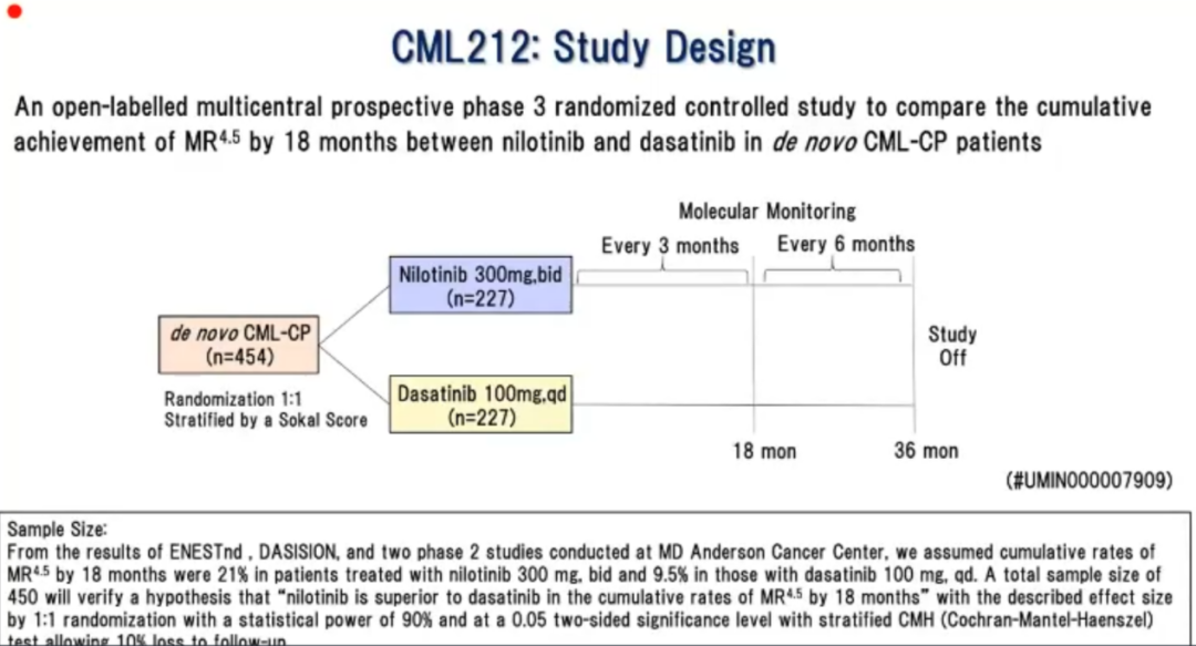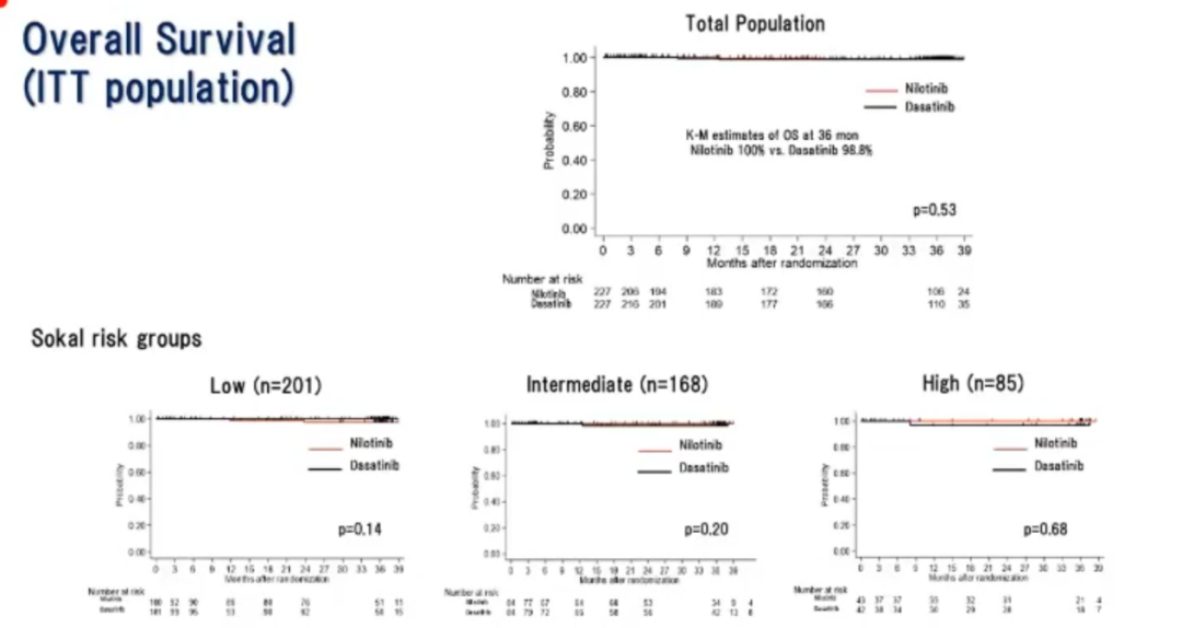 在这些研究中颇有亮点的JALSG CML 212是一个前瞻性多中心开放标签随机对照III期研究,主要终点是18个月的累积MR4.5率。82个中心454例新诊断CML患者按照sokal评分进行随机分组。尼罗替尼和达沙替尼18个月的累积MR4.5分别为33%:30.8%(p=0.62),坚持用药者比例分别为75.9%:79.6%(p=0.36),两组PFS、EFS和OS均未见显著性差异。这是全球首个前瞻性随机比较二代TKI药物效果的研究。