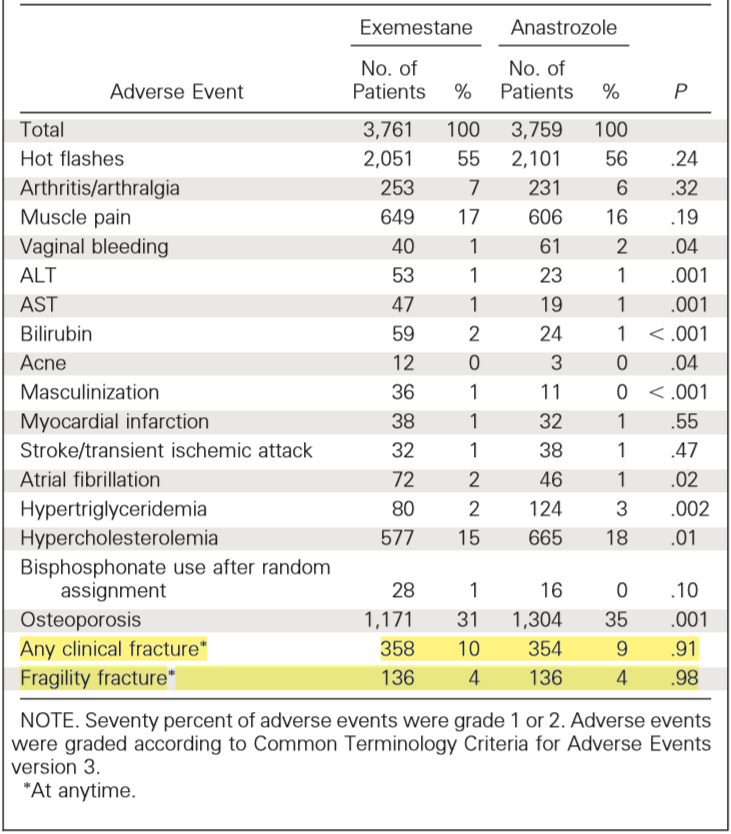 在骨安全性方面,MA. 27研究显示阿那曲唑与依西美坦两组临床骨折和脆骨性骨折发生率无差异。依西美坦的雄激素样结构可能与轻度肝损害、雄激素样反应等事件有关。在治疗3年时,两组各有约1/4的患者中断治疗,两种药物的依从性无差异。