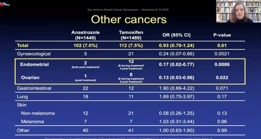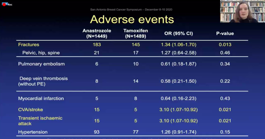 相反,阿那曲唑对ER阴性乳腺癌没有观察到有疗效。与他莫昔芬相比,阿那曲唑在减少浸润性乳腺癌复发方面没有显著差异。与他莫昔芬相比,阿那曲唑对浸润性ER阳性乳腺癌的疗效无显著性降低24%(44例 vs.59例;HR=0.76,95%CI:0.51~1.12),p=0.17)。共报告了127例死亡,两种治疗方法的全因死亡率无显著差异(61例vs.66例;HR=0.94,95%CI:0.67~1.33,p=0.74)。只有7例死于乳腺癌(3例 vs.4例),随访到12年时死于乳腺癌的人数很少,对生存率的影响不太可能通过更长时间的随访而显现。报告214例乳腺癌以外的癌症,使用阿那曲唑观察到无显著性降低(97例 vs.117例,OR=0.84,95%CI:0.63~1.12,p=0.22)。阿那曲唑治疗子宫内膜癌(2例vs.13例,OR=0.16,95%CI:0.02~0.0.69)、卵巢癌(1例vs.9例,OR=0.11,95%CI:0.003~0.82)和非黑色素瘤皮肤癌(11例vs.21例)较少见。与他莫昔芬相比,阿那曲唑组的骨折发生率(181例vs.145例,OR=1.32,95%CI:1.04~1.68)和短暂性缺血发作(15例vs.5例,OR=3.10,95%CI:1.07~10.92)显著增高。未来将报告全面的不良事件概况。