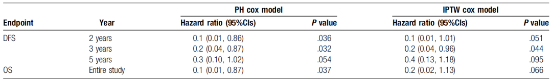 表1. PH cox模型和IPTW cox模型的风险比及其置信区间