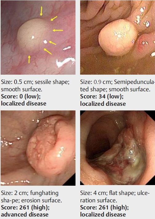 图2. 基于直肠NET内窥镜检查外观的新评分系统(分数越高,晚期疾病的风险越高;最佳截断值为110分)及示例。