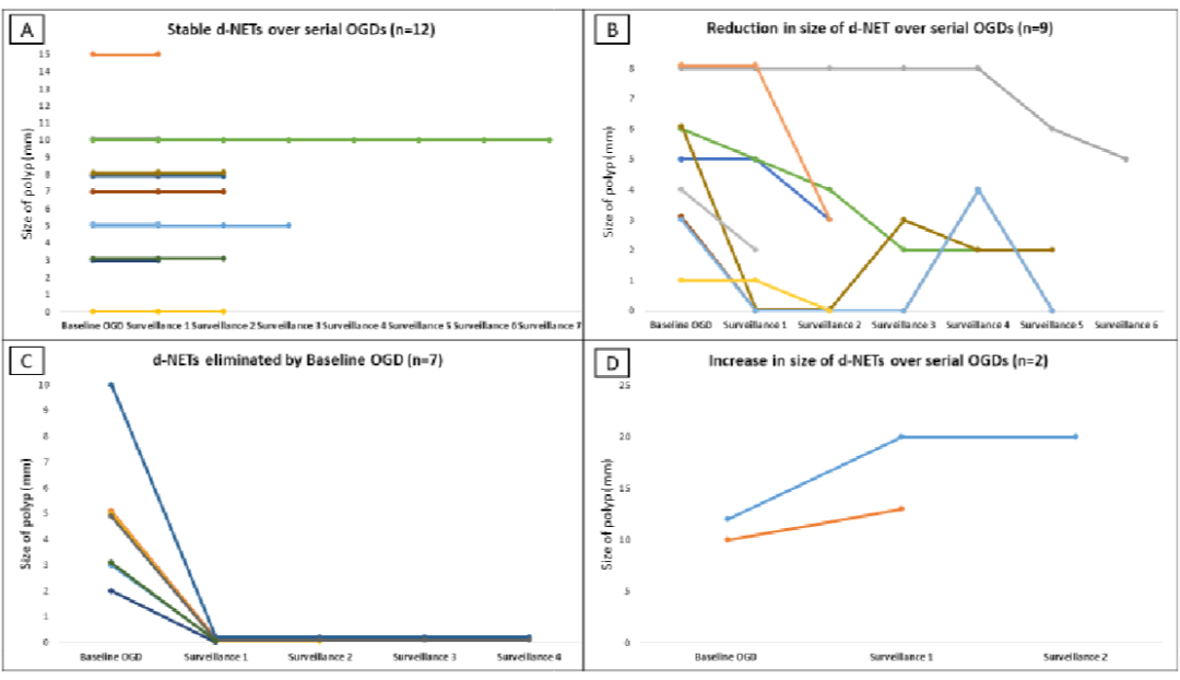 A:连续OGD保持完全稳定的患者;B:d-NETs大小随时间的推移而缩小的患者;C:初次内窥镜检查d-NETs被活检钳完全撕脱的患者;D:在随访期间d-NET大小增加的患者。