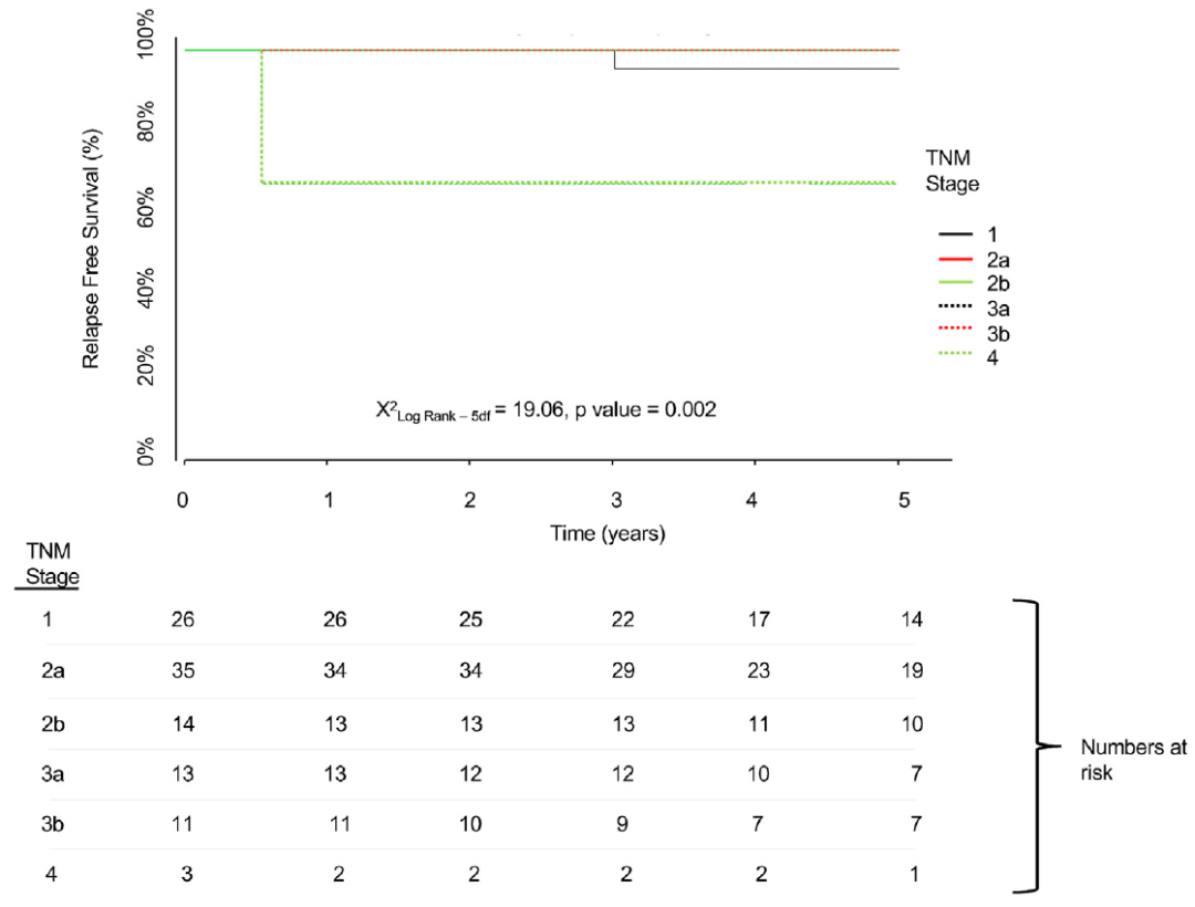 图5. 根据ENETS TNM分期的5年无复发生存率(显示风险患者人数)
