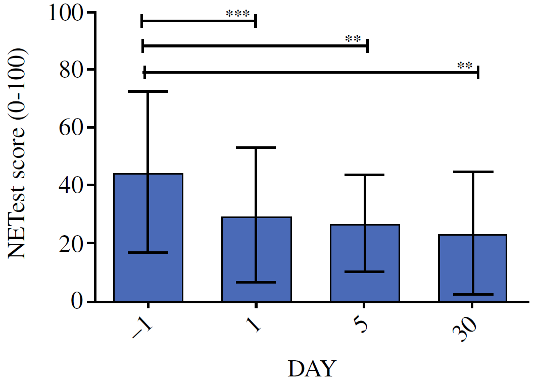 图6. NETest评分与手术切除的关系。在4个不同的时间点测量NETest:术前、POD1、POD5和POD30。条形图表示平均值和标准差。统计显著性:***P≤0.001;**P≤0.01。NETest,神经内分泌基因转录水平;POD,术后天数。