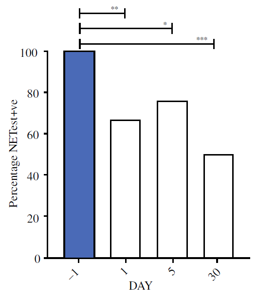 图7. NETest评分变化和手术。在4个不同的时间点NETest阳性患者百分比:术前、POD1、POD5和POD30。条形图表示评分阳性的百分比。统计显著性:***P≤0.0001;**P≤0.001;*P≤0.01。NETest,神经内分泌基因转录水平;POD,术后天数。