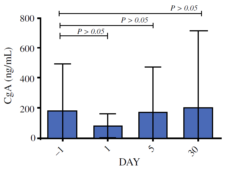 图8. CgA与手术切除的关系。在四个不同的时间点测量CgA:术前、POD1、POD5和POD30。条形图表示平均值和标准差。统计显著性:***P≤0.001;**P≤0.01。CgA,嗜铬粒蛋白A;POD,术后天数。