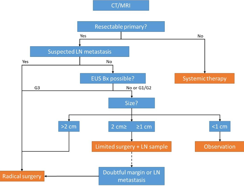 综上,疑似LN转移或G3 PNET或肿瘤>2 cm时需进行根治性手术。密切监测对于<1 cm的PNETs或许已经足够。1-2 cm大小的肿瘤需要进行局限性手术并进行LN切除,但如果切缘可疑或有LN转移,则应改用根治性手术。