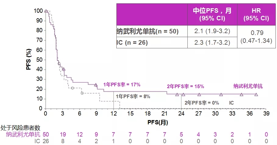 与CR/ORR和DoR获益相对应的是无进展生存(PFS)获益,纳武利尤单抗组和对照组的中位PFS数据相当;1年PFS率分别为17%和8%;2年PFS率分别为15%和0%。