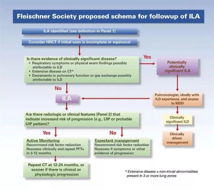 识别胸膜下纤维性ILAs很重要,这种类型的ILAs更容易进展,并与死亡率增高相关。治疗ILAs,需要区别具有临床显著症状的 ILD和亚临床ILAs。Fleischner学会提出了一种ILA患者的随访方案(图2)。