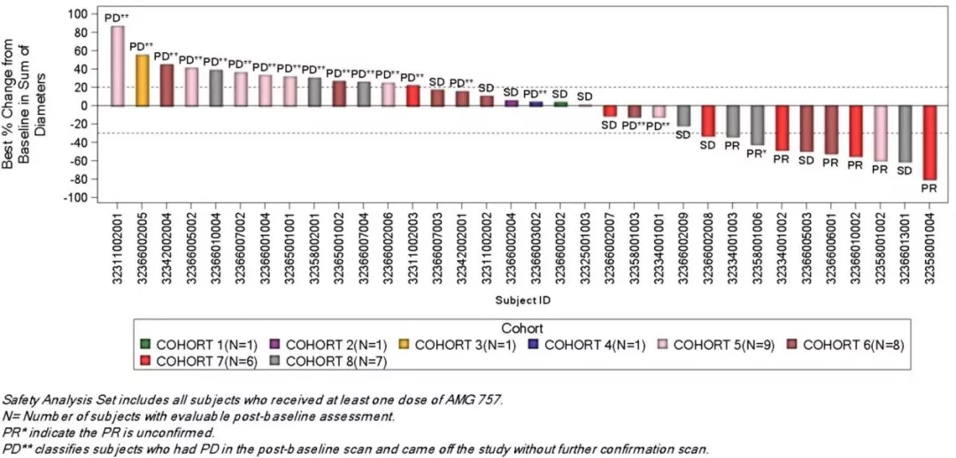 18例(45.0%)患者出现细胞因子释放综合征(CRS);5例(12.5%)G2级CRS,没有G3 CRS;CRS主要表现为发热±低血压,具有可逆性,未导致治疗中断或停药,多发生在前两剂AMG 757治疗后24小时内,并通过支持治疗、糖皮质激素和/或抗IL-6治疗进行管理;