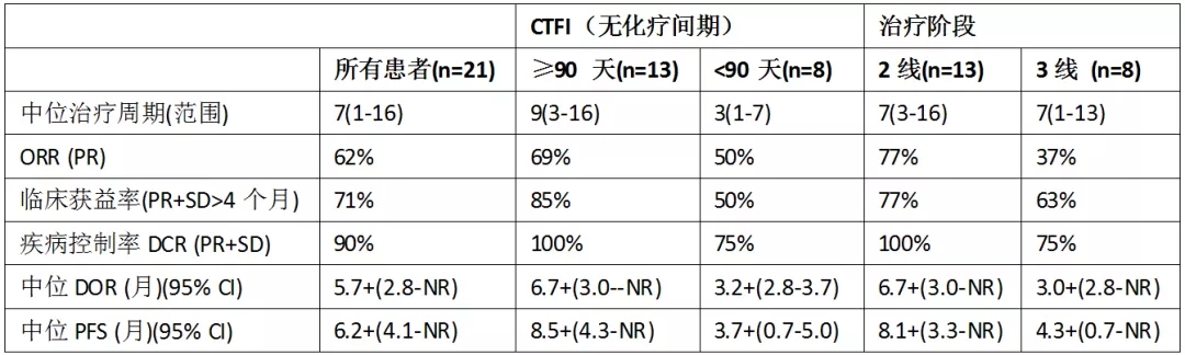 21例患者中女性占比52%;中位年龄61岁(52-74岁);ECOG PS 0/1分别占24%/76%;无化疗间期(CTFI)≥90天和<90天的患者分别占62%和38%;既往治疗线数1线占62%,2线占38%;既往接受免疫治疗者占19%;肝转移患者占48%;24%患者有中枢神经系统转移。截至2020年8月12日,11名患者仍在接受治疗。中位随访8.7个月,疗效数据如下: