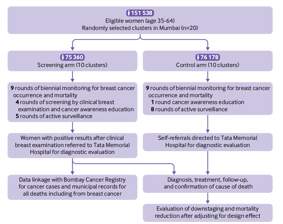孟买研究为一项前瞻性、整群随机对照试验。在印度孟买设置了20个地理位置不同的集群,随机分配至10个筛查区域和10个对照区域;该研究开始于1998年5月,2019年3月开始数据库锁定并进行数据分析。期间共入组了151538名年龄35~64岁之间的无乳腺癌病史的女性。