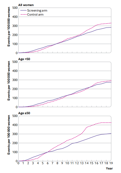 事后分析显示,50岁及以上女性乳腺癌死亡率相对降低了近30%[24.62(20.62~29.76) vs. 34.68(27.54~44.37);RR=0.71(0.54 - 0.94);P=0.02],但小于50岁的女性死亡率无显著降低[19.53(17.24~22.29)vs. 21.03(18.97~23.44);RR=0.93(0.79~1.09);P=0.37]。与对照组相比,筛查组的所有原因死亡率降低了5%,但无统计学意义[RR=0.95(95%CI:0.81~1.10);P=0.49]。
