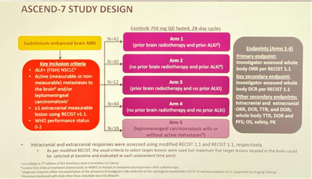 以ASCEND -7研究为例,它是目前唯一一个探索有症状进展期脑转移或脑膜转移的临床研究,共分为5组来探索塞瑞替尼(空腹750 mg/天)疗效和安全性。由于5组研究入组患者基线全然不同,所以将他们作为5个单臂研究的结果来解读。