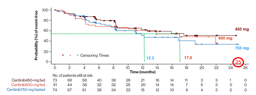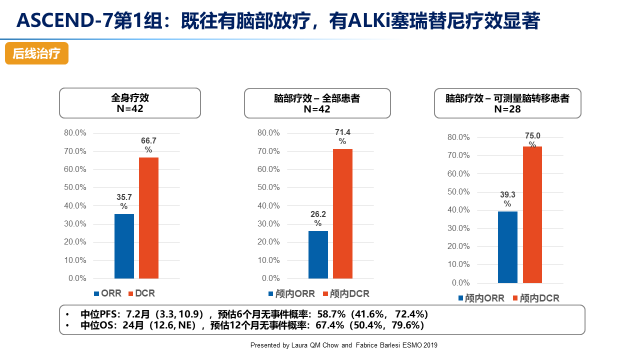 • 第1组-后线:既往使用过ALKi;既往接受过脑部放疗,但放疗未控制住的患者,这组患者接受塞瑞替尼治疗后中位PFS为7.2个月,中位OS为24个月。