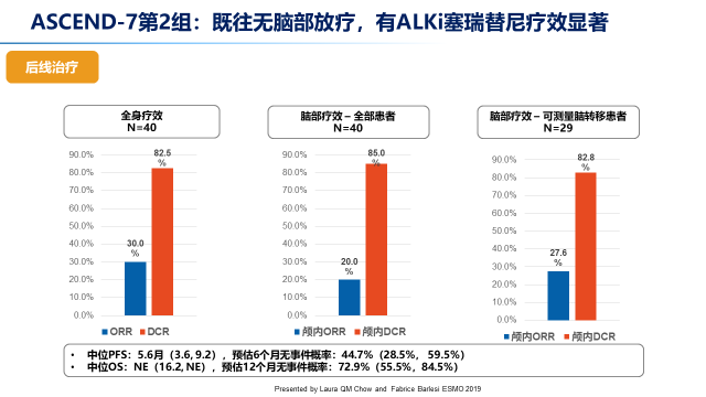 • 第2组-后线:既往使用过ALKi;既往未接受过脑部放疗的患者,这组患者接受塞瑞替尼治疗后全身疾病控制率高达82.5%,整个颅内疾病控制率高达85%。