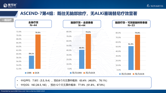 • 第4组:从未使用过ALKi;既往未接受过脑部放疗的患者,这组患者接受塞瑞替尼治疗后全身疾病控制率和客观缓解率分别达到70.5%和59.1%,整个颅内疾病控制率高达75%。