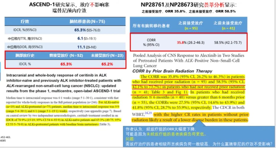 褚倩教授:既往研究发现放疗的应用对不同ALKi的疗效会产生不同的影响。阿来替尼相关临床研究数据显示脑转移患者进行脑放疗后使用阿来替尼的颅内疗效下降40%,而塞瑞替尼相关研究结果显示放疗的使用不影响塞瑞替尼的颅内疗效。“ALK之母”ALICE SHAW认为,阿来替尼经放疗组的ORR大幅度下降,可能是因为未经放疗组的患者的整体疾病负荷更低。