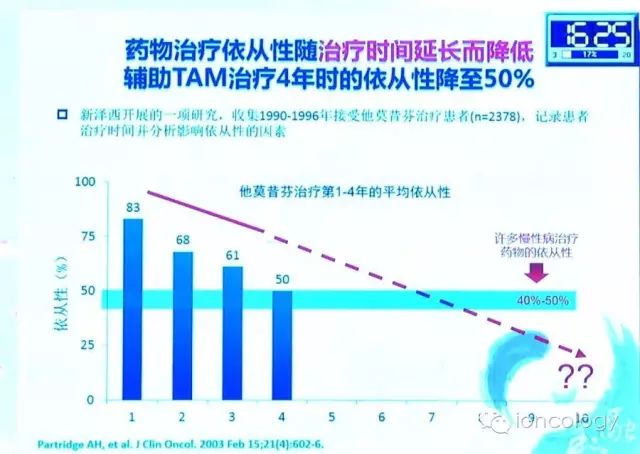 5年SERM治疗曾长期作为绝经前雌激素受体阳性患者内分泌治疗的金标准,近年来ATLAS和aTTom研究均表明10年TAM治疗疗效优于5年,延长内分泌治疗疗程可能给患者带来更多获益的理念逐渐得到认可。此外,袁芃教授特别提到,患者的依从性是SERM类药物辅助内分泌治疗的真正挑战,并分享了一些国内外相关的研究报告。